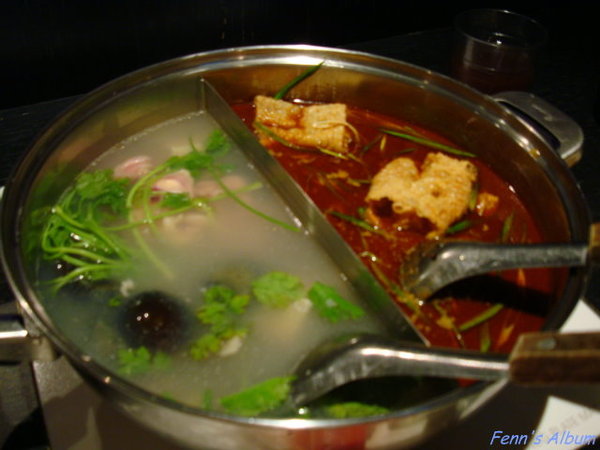 噹噹~~ 湯底上來囉,我們點的是香菜皮蛋鍋跟港式麻辣鍋!香菜皮蛋鍋真的很清爽,加上店家特製的花雕雞之後風味更佳。港式麻辣則是又辣又香,但又不會因為煮太多食材導致味道變淡,其他可以選的湯底還有