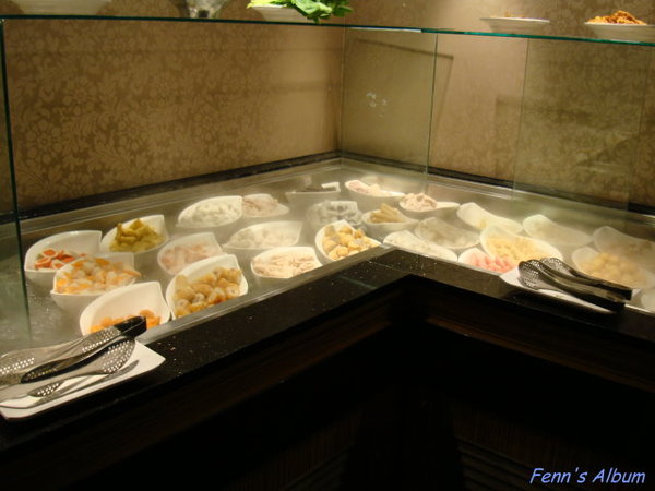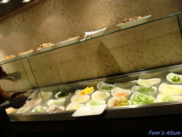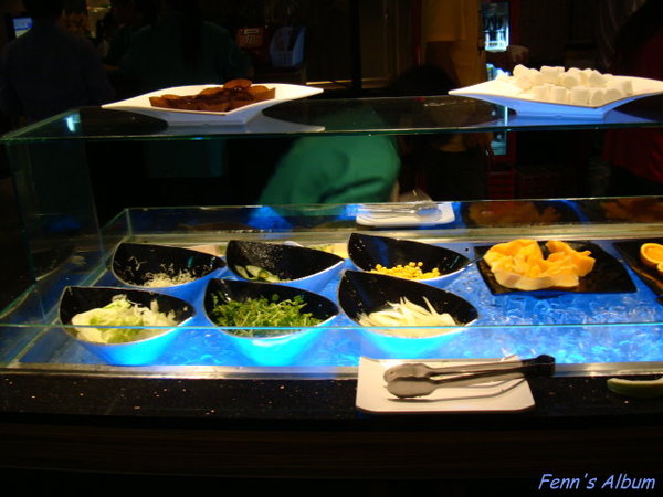 這邊是沙拉及水果區,店家在所有食材下放的都是冰塊而不是採用一般放置在冷藏櫃的方式,滿特別的。上方則是巧克力噴泉的材料 棉花糖!
