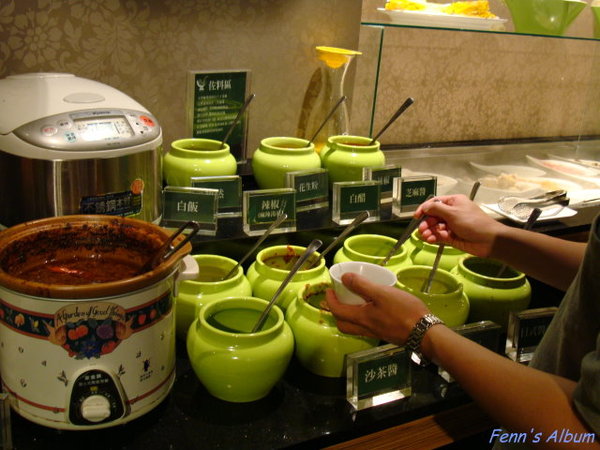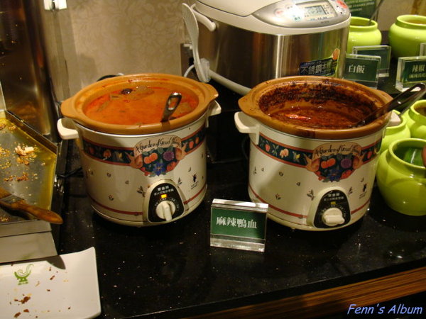 這是在醬料區旁提供給客人自取的麻辣鴨血 (左邊那鍋) 鴨血吃起來帶有甜味,隨後喉間上來的是微微的辣味。右邊那鍋則是謎樣的魯肉....沒人敢吃 = =