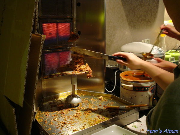 這難道就是傳說中的自助式沙威瑪!!!!! 飛真的是第一次在這種店看到,店家在客人取用完之後會直接將雞肉層層串好放在上面燒烤至熟,所以想吃的人動作可要快一點唷!不然你就只好等等等~~~ 不過比較美中不足的是左邊那個紙箱,似乎店家的用意是用來擋油的,弄的好看一點就好了