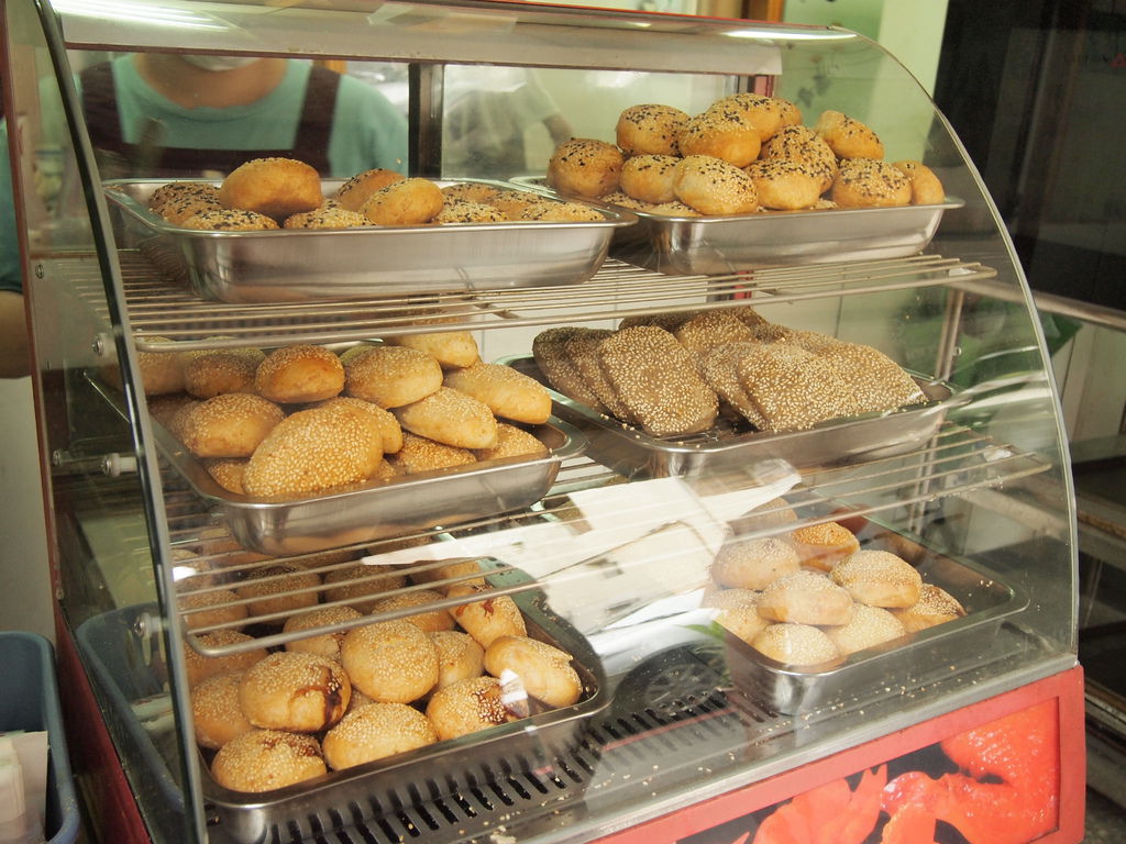 看起來都好好吃唷~有芝麻醬燒餅、芝麻糖燒餅、紅豆燒餅、蔥肉燒餅四種口味。最上面的是紅豆,中左是芝麻糖、中右是芝麻醬,下面是蔥肉燒餅,一個才15元~