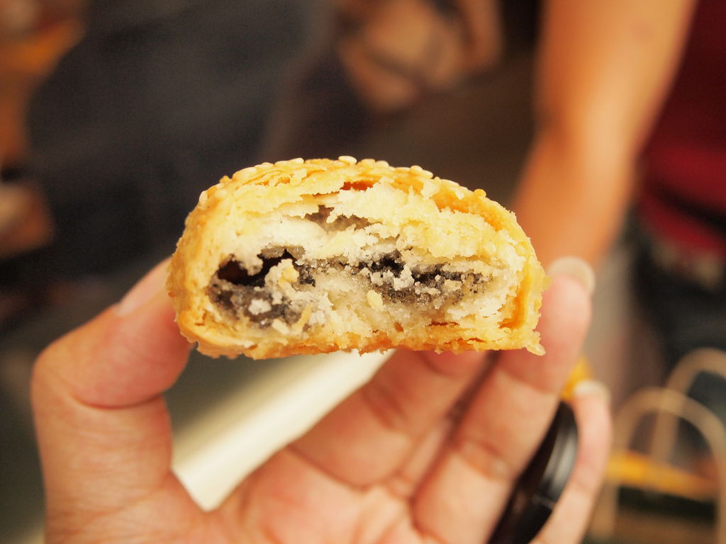立刻先嚐一下,芝麻糖燒餅裡面包的是芝麻餡跟糖,外皮烤的很酥脆~芝麻香味在咬下去的瞬間四溢~糖粒夾雜在芝麻醬中間口感超棒!我吃一個立刻就愛上它了~
